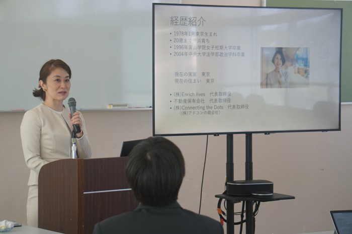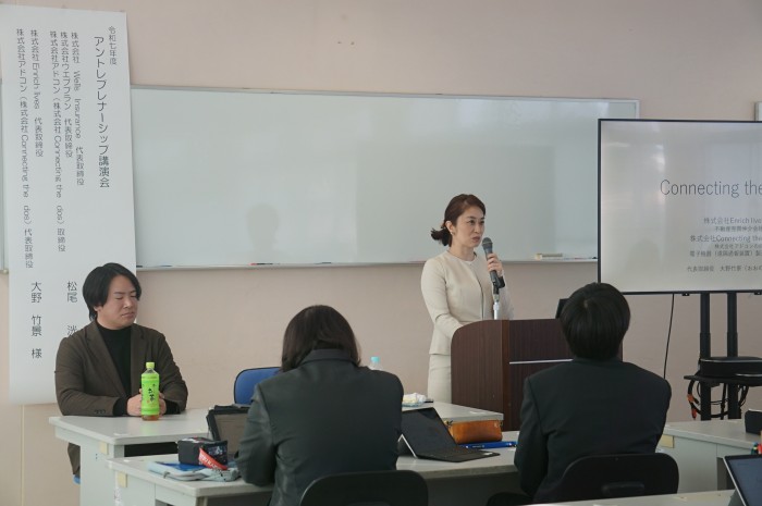 株式会社Wells Insurance代表取締役の松尾洸様と株式会社Enrich lives代表取締役の大野竹景様を講師としてお招きし、アントレプレナーシップ講演会を実施しました。