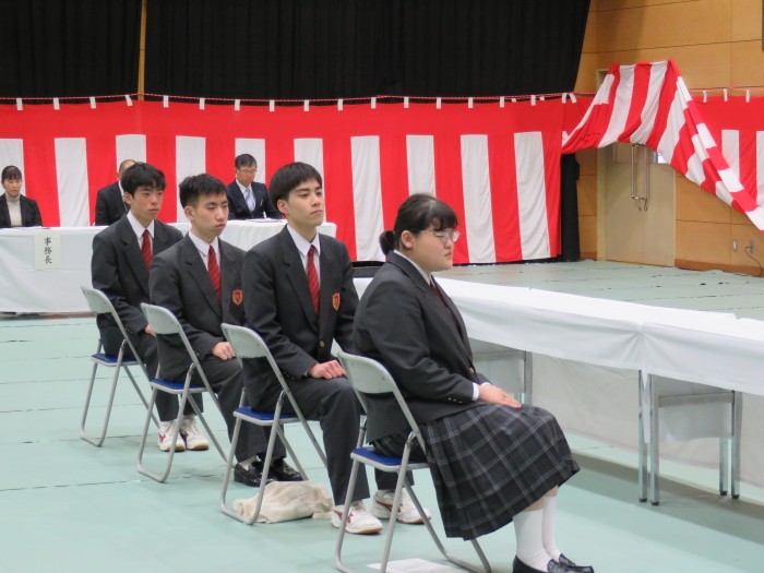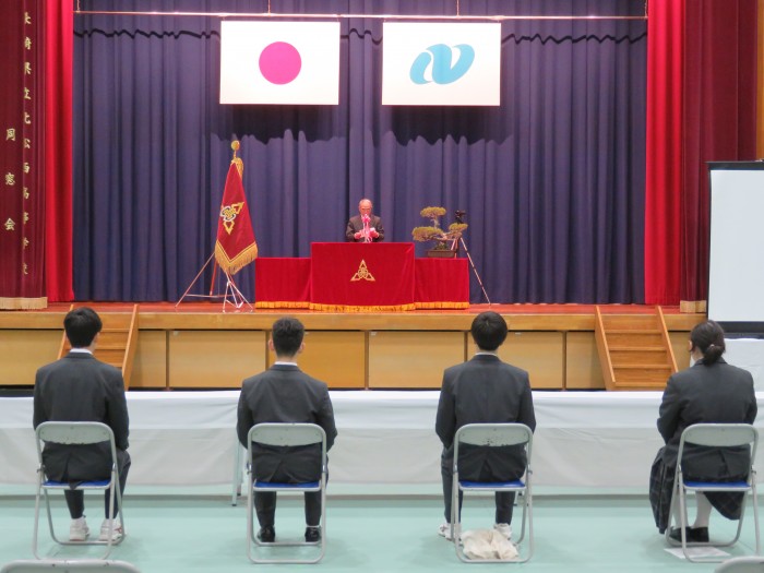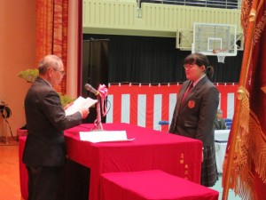 同窓会長の吉元勝信様よりご挨拶をいただき、代表として尼崎結菜さんが記念品を受けとりました。