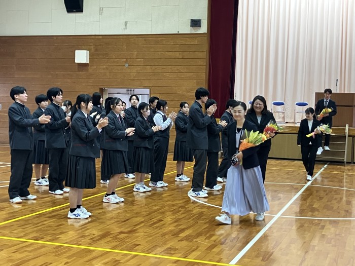 今年度は本校から8名の先生方が去ることになり、離退任式ではそれぞれの先生方から生徒に向けて温かいお言葉をかけていただきました。