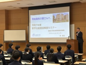 講演では、長崎大学の入試問題の出題方針やポイントを具体的な出題例を交えながら丁寧に説明していただきました。参加した生徒からは「大学入試で求められる力が具体的に理解できた。」といった感想が上がりました。本セミナーが今後の学習に向けて新たな意欲を高める貴重な機会となることを期待します。
