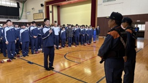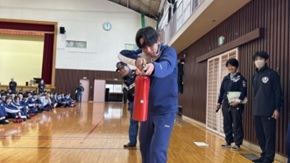 【消火訓練の様子】 【生徒代表お礼の挨拶(3-4 永石 光 さん)