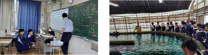 3日目は、午前中になかはら養殖場見学に向けた事前学習をしました。事前学習では、燃料電池についての講義を受け、水の電気分解で得た水素を使ってエネルギーに変換する原理を学び、実験で水素を用いて発電している様子を観察しました。午後は実際に、教科書で学んでいることが、壱岐で最先端の養殖業に応用されているところを見学しました。