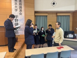 2月10日(火)、東京大学より宇野健司先生をお招きして進路講演会を実施しました。講演では、実際に大学生のゼミでも実践されているディスカッションの進め方について学びました。ディスカッションで意識すべきポイントを教えていただき、発表の際には全員挙手というルールのもと、3人1組で活動を進めました。また、意見を伝える際には「結論→理由→具体例→結論」の順で話すPREP法が有効であることも紹介され、社会的スキルについても学びを深める機会となりました。講演の最後にはマンダラチャートを作成して、全員が発表しました。