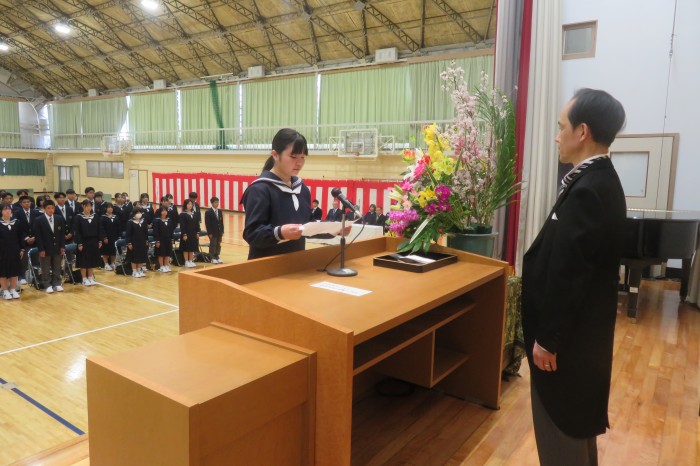 89名の入学が校長より許可され、新入生を代表して森田 紗妃さんが宣誓を行いました。