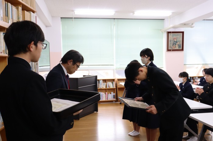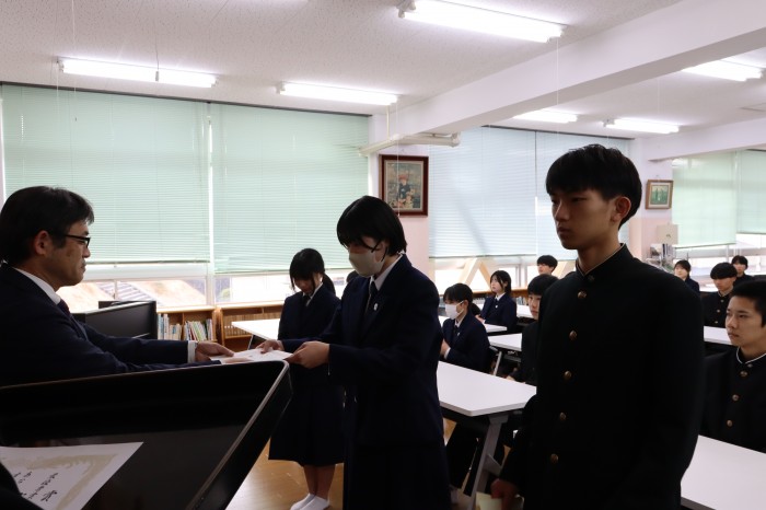 終業式の前には表彰伝達式があり、税に関する作文や読みたい本POPコンクール等で受賞した3名の生徒にそれぞれ表彰状が手渡されました。