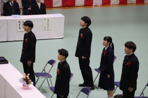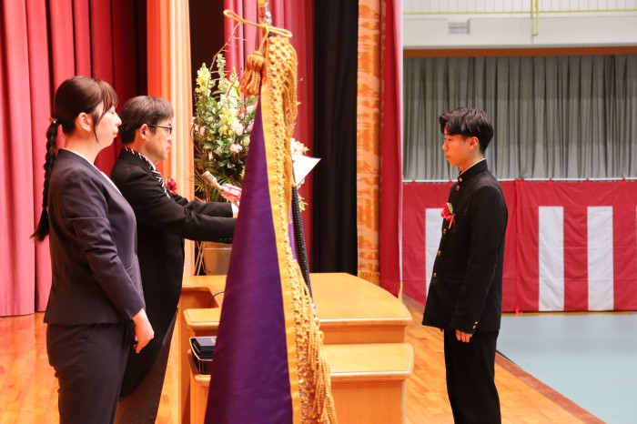 式に先立つ2月28日には、同窓会入会式および表彰伝達式があり、新たに奈留高校の同窓会に加入する12名の卒業生に村木同窓会長より歓迎の言葉と記念品が贈られました。表彰伝達式では、教育委員会、高体連、高文連および家庭クラブから、それぞれの分野で活躍した4名の生徒に対し表彰が行われました。