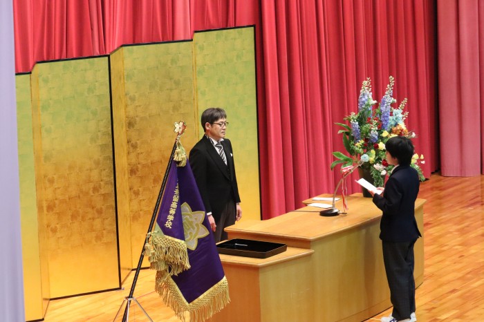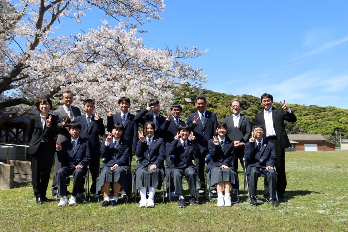 4月8日、入学式を執り行いました。本年度は、離島留学生8名、奈留中学校から3名、計11名の新入生に加えて転入生1名を迎え、全校生徒25名でスタートします。新入生は、緊張した様子ながら堂々と入場、宣誓、代表あいさつをし、入学前オリエンテーションで先輩たちから習ったばかりの校歌と愛唱歌を歌い、入学式を待っていたかのように満開を保つ桜のもとで記念撮影を行い、奈留高生としての一歩を踏み出しました。11名の今後の成長と活躍を心から応援しています。