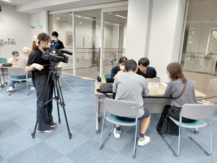 本校パソコン部の生徒がスマートフォン使いのプロフェッショナルとして、来場されたお客さま相手に学校の先生顔負けの親切丁寧な説明をしていました。内容は、1)スマートフォンの基本操作方法 2)よく使われるアプリの活用方法 3)スマートフォンの安全な使い方 4)その他、スマートフォンに関連する問題全般 についてでした。地元テレビ局の方も取材に来られて、活動の様子を撮影されていました。