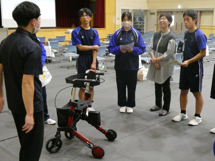 介護ロボットとは、高齢者や障がい者の生活支援や介護者の負担軽減を目的として開発されたロボット技術を活用した機器のことで、課題解決策の一つとして注目されています。その用途も、移乗支援から入浴支援、コミュニケーション支援など幅広く活躍が期待されています。見慣れない介護ロボットの登場に生徒達も興味津々でした。