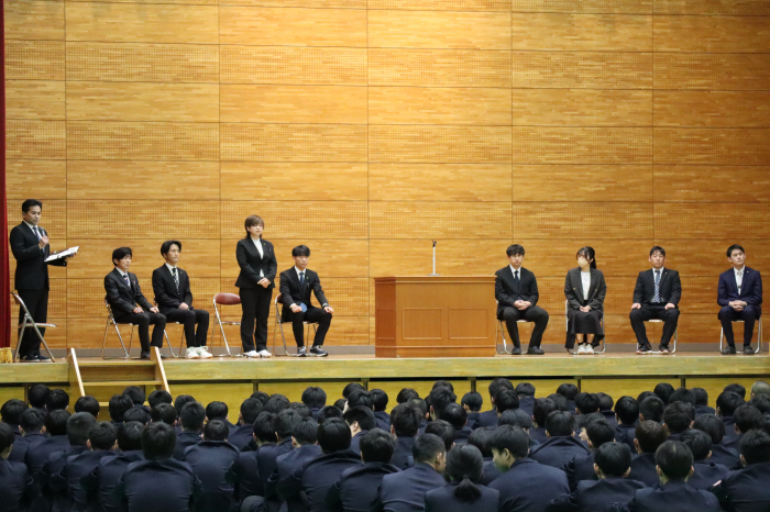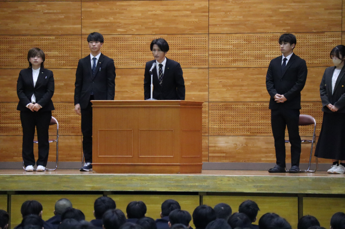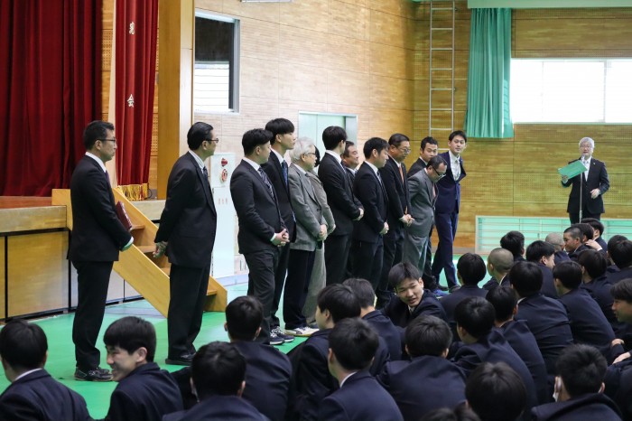 続く始業式では、校長先生より本年度の学校スローガン「自己変容」についてお話があり、生徒たちは真剣な表情で耳を傾けていました。
