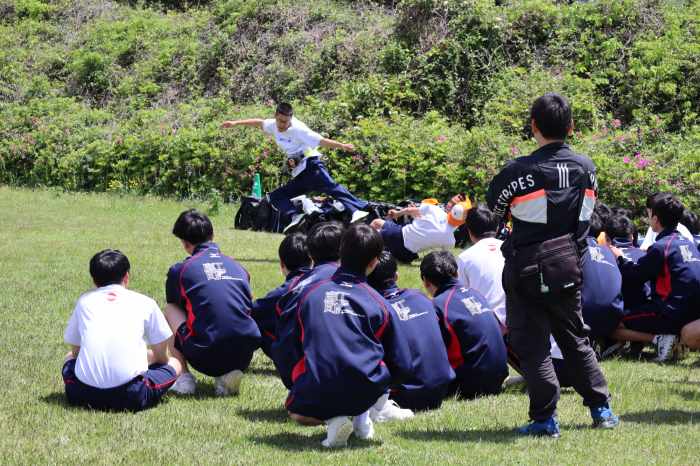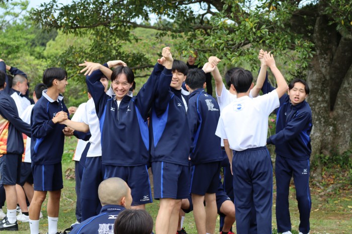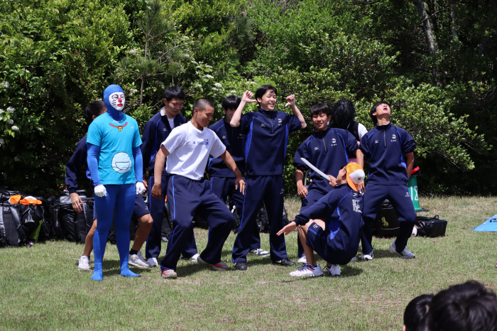 山頂での歓迎行事の様子。新・転任の職員紹介やレクレーションで大いに盛り上がりました。