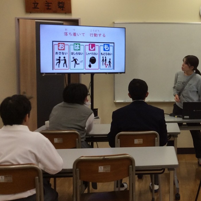今回はスモークマシンを使用して視界が悪い中での避難や、校内の放送機器が故障していたため教員による口頭での避難指示など、普段と異なる環境で訓練を行いました。