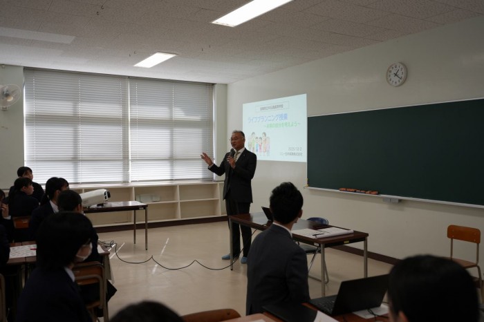 受講した生徒から、「最初『ライフプランニング』という言葉を聞いて、難しい内容なのかと思っていました。説明を聞いていくと、将来どんな風に過ごしていくのかなどの計画を立てることを今回の授業で初めて行い、グループの皆と色々な話をしながら人生のプランを立て、楽しく学ぶことができました。」、「人の意見も聞き入れながら何を買うかなど決めることは難しいと思いました。自分の将来のことを考えることができる時間になり、将来のことを考え、貯金をしながら生活していきたいと思いました。」、「自分の将来就きたい仕事については考えたことがあるけど、お金のことは全く考えたことがなかったので、いい時間になりました。上級学校にいくためにたくさんのお金が必要であることをしっかり頭に入れておき、授業は真面目に受けようと思います。」、「講師の方と一緒に計画を立てることで、グラフや詳しい金額など画面を見ることで分かりやすく変化を見ることができたので、計画を立てやすかったです。講師の方も、分からないところを聞いたら優しく答えてくださり、話題を振ってくださったので話やすかったです。」、「班の講師の方がパソコンの表などを見せてくださり、車、家、学校にかかるお金などに加え、育休がどれくらいまで取れるかを教えていただきました。」、「自分のライフプランを考える上で、優先順位で黒字か赤字か決まるので、これから生活する時はしっかりと必要なものと不必要なものを見極めていきたいと思います。自分の人生や人の人生を考えられるライフプランナーの方々はとてもすごいと思いました。」、「他の班の人たちの発表を見て、人それぞれのライフプランニングがあり、貯金額が変わったりしておもしろかったです。」、「今回、初めてライフプランを考えました。今の自分が将来どのようになっているのか分かりませんが、今の自分にできる勉強や生活をしっかりと整えていきたいと思います。生活費を節約することで他のことにも使えるので、一人暮らしになっても節約していきたいです。」、「講師の方による最後のメッセージの『目標までの間に小さい目標をつくる』というのが、とても印象に残っています。今後、自分でもプランニングをして目標を決めて一つ一つ達成していきたいです。」といった所感が寄せられました。