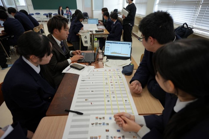 2時間連続の授業のうち、1時間目に人生設計の在り方等について説明を受けた後、設定された仮想家族に対して4人又は5人のグループに分かれて親の立場からその家族の将来設計を話し合ってイベントプランニングを作成し、その収支結果・改善策の検討を2時間目に各班に配置された講師(ライフプランナー)の方々の助言及び支援を受けながら行い、最終的には各グループの取組及び作成上の留意点等について共有しました。