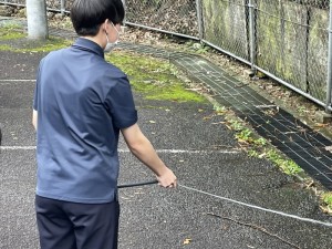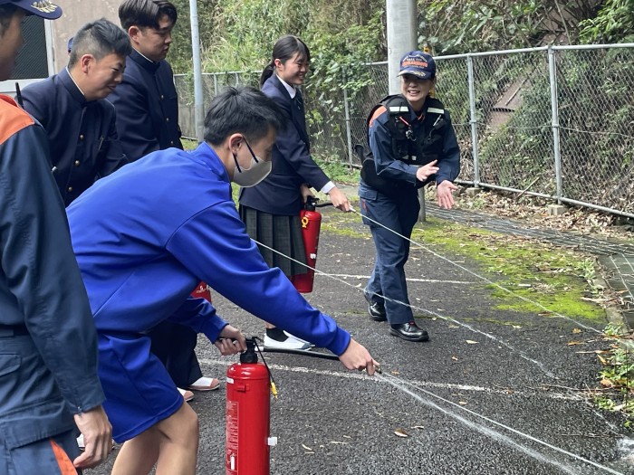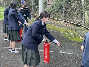その後、消火訓練を行いました。スムーズな消火器使用のための合言葉「ピ・ノ・キ・オ」を学び、数名の希望者が実際に消火行動にチャレンジしました。「火事だー」と大きな声を発し、素早く行動する姿が見られ、真剣さが伝わってきました。