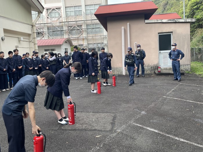 4月15日(水)6校時、防災避難訓練を実施しました。年度のはじめに避難経路の確認や想定される被害についてクラスで確認し、適切に避難行動をとることができるようにするための訓練を行いました。新上五島町消防若松支署の職員の方々立会いのもと実施し、生徒1人1人は的確かつ迅速に行動することができました。講評においても、口元をマスクで押さえたり、指示にしたがって静かに行動したりする姿に対して評価いただきました。