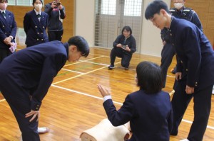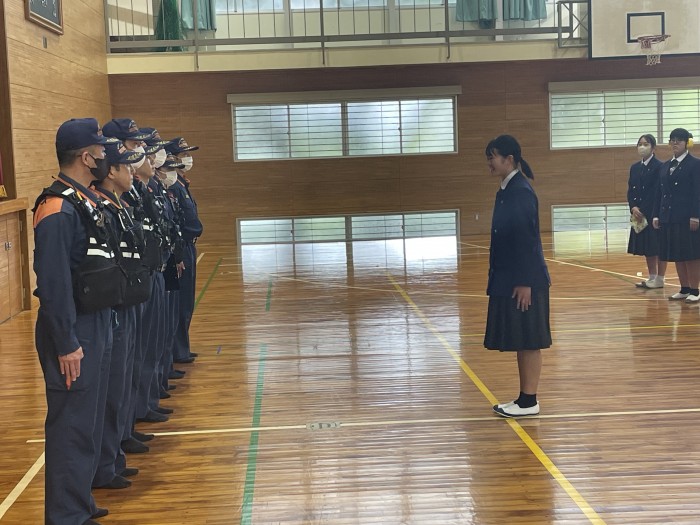 最後に保健体育美化委員長の冨野さんがお礼の言葉を述べました。「今回の訓練を通して、非常事態には冷静にかつ的確迅速に行動できるようにしていきたい」と語っていました。生徒だけでなく、職員にも消防署員の方から講評をいただき、さらなる連携強化の為のご助言いただきました。ありがとうございました。