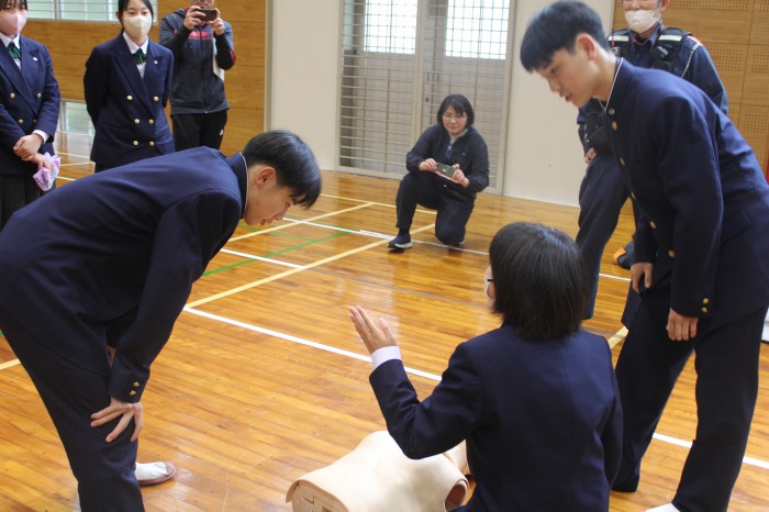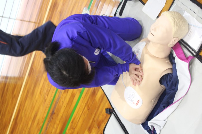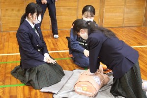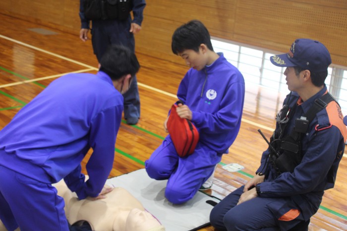 消火訓練の後に、救急救命講習を受けました。主に心肺蘇生法について学び、実習を行いました。3つのグループに分かれて行いましたが、どのグループも積極的に実習に参加し、「わかってできる」救助行動を身に付けることができました。