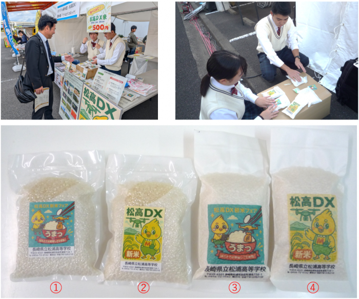 令和7年10月26日(日)、松浦市文化会館で開催された「第23回松浦水軍まつり」において、文部科学省「高等学校DX加速化推進事業(DXハイスクール)」の取り組みとして、ドローンを活用したスマート農業に挑戦した成果として、松浦市農業委員会のご協力でお借りした圃場で収穫できた新米を販売しました。
