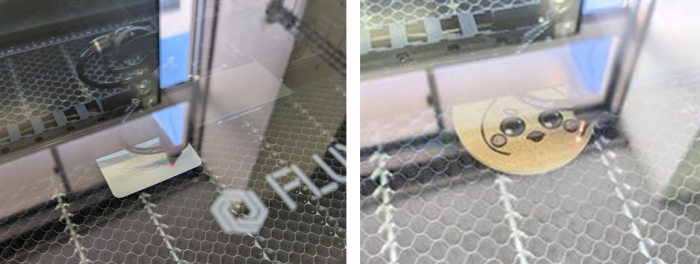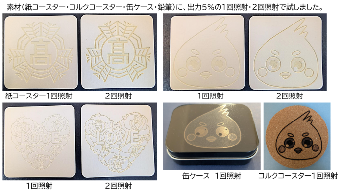 紙コースターは、発火もなく、煙が少し出る程度でした。2回照射で試してみると、図柄・イラスト・模様がはっきりとなりました。缶ケース・コルクコースターも同様で、想像以上のクオリティでした。