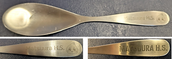 CO2レーザー加工機のため、金属への彫刻は推奨されていません。ですが、調べていく中で、金属加工用のマーキング剤を塗布し、レーザー彫刻後、洗い流す方法で、試してみました。オリジナルスプーンの完成です。 |