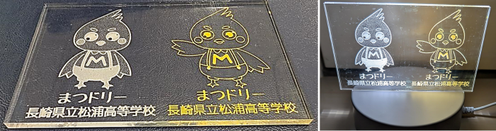 アクリル板の加工は、ガラス・金属に比べると難しくなく、仕上がりも想像以上でした。アクリル板の裏側から直接レーザー加工したもの(左)。マスキングテープを貼付して裏側からレーザー加工後、ラッカースプレーで色付けしたもの(右)。LEDライトを当てておしゃれにディスプレイしてみました。 |