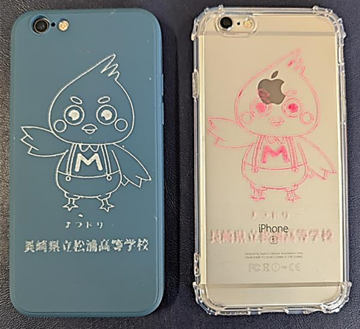 シリコーン素材や熱可塑性ポリウレタンのスマホケースでも試してみました。マスキングテープを貼付した加工であったため、加工にむらがあり、アクリル絵の具での色付けはうまくできませんでした。設定等を変更し、再度挑戦してみます。 |
