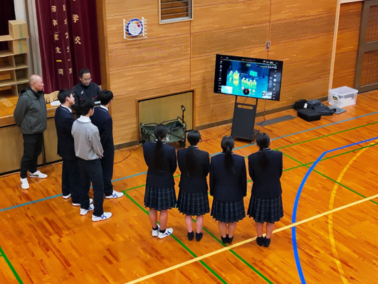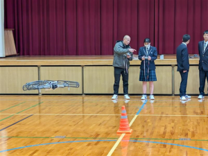 初学者向けのドローンの基本操作を体験して、ドローンが飛行する仕組みや安全に関する注意事項などの説明を受け、体育館全体を使って、上昇・下降・前進・後退・左右移動・左右旋回などの操作方法を学んだあと、スクウェア飛行など応用的な飛行を練習しました。