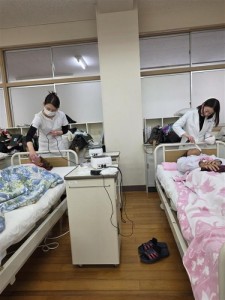 生徒たちはマッサージの後の体感の変化に感動したり、超音波を当てた後の友人の肌の変化に