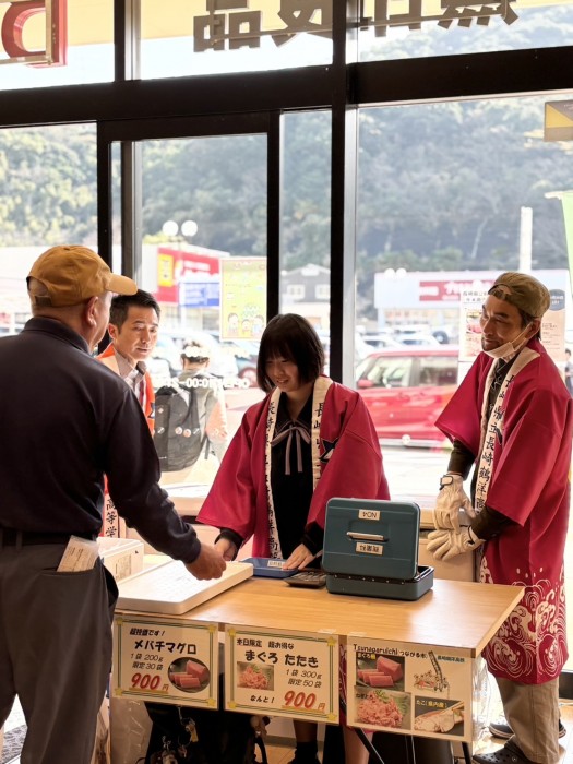 3年情ビ系列生徒が接客を担当しました。今回の目玉商品は、まぐろ柵、
