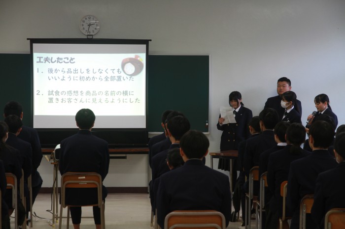 これまでの活動で行ってきた商品の企画・仕入れ・販売活動を振り返り、売上や経費、利益の状況について生徒が資料を用いて報告しました。