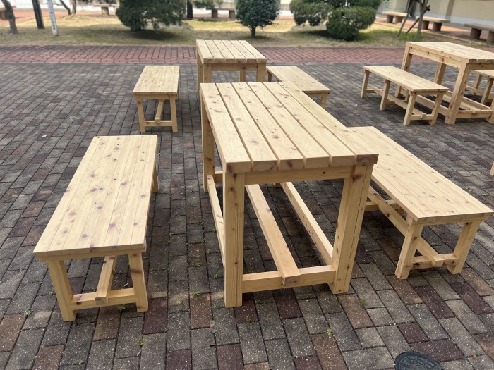 3月16日(月) 諫早商業高等学校様より受注いただいた、テーブル6台、ベンチ12台を納品させていただきました。