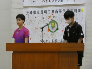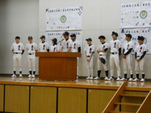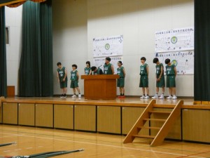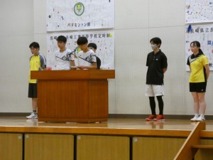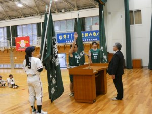 令和7年6月6日(金)本校体育館で壮行式を行いました。バスケットボール、卓球、バドミントン競技、軟式野球へ参加します。
