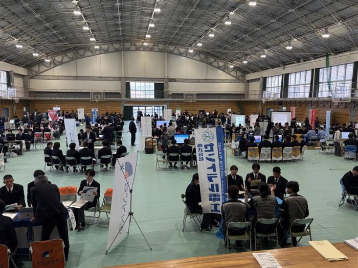 令和8年3月11日(水)全日制の県内企業説明会に3年生が参加しました。説明会参加企業56社の中から、希望する企業・職種等に関係する企業から説明を受けました。4月からの進路実現へ向けて貴重な説明会となりました。
