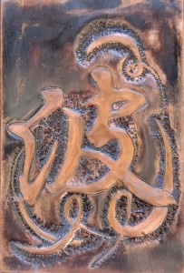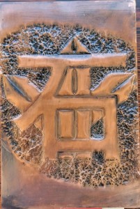 作品は、銅板に漢字を書いて背景をアレンジしたものです。1年生の美術の授業で作成したものです。