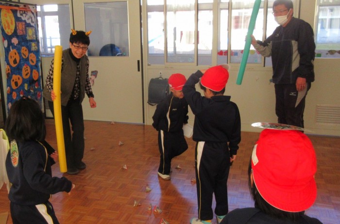 節分には、子供たちのために鬼になってもらい、豆まきを楽しみました。