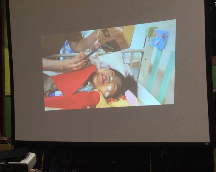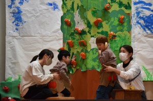 みさかえ地区の3名は、こぶたになってわらの家、木の家、レンガの家を作りました。諫早地区の3名は、それぞれのやり方で家を倒すオオカミになりました。みさかえ地区の子どもたちは動画での出演で、諫早地区の子どもたちは舞台で演技をしました。全員練習をがんばり、協力して一つの劇を披露することができました。