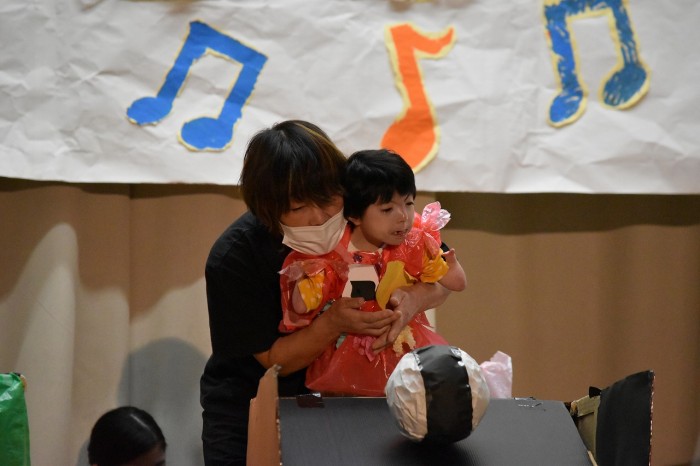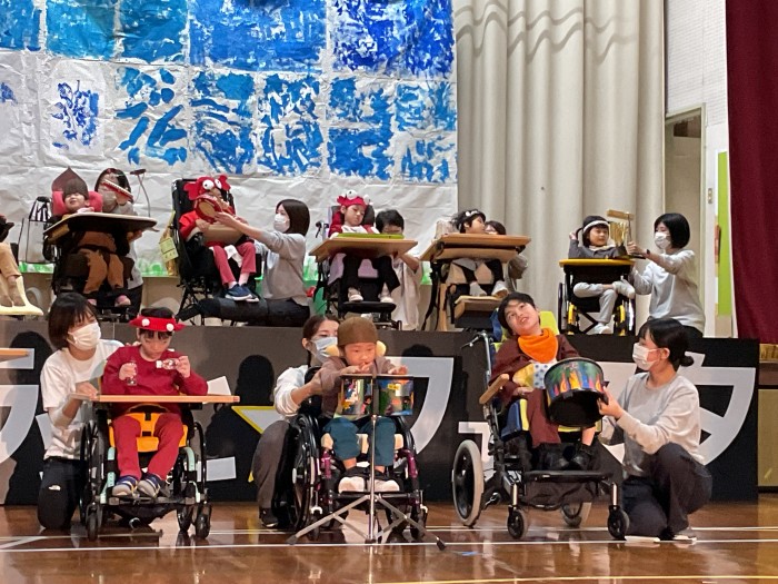 立ち上がって柿の実を取るサル、カニ歩きダンスで柿の木を育てるカニ、ボールを転がし、猿をやっつけるクリ、スイッチやウォーカーを使ってサルに体当たりするウス、サルの腕を引っ張り、柿を取り返す子ガニが大活躍した劇「さるかにばなし」。最後は、「まじっくまんぼ♪」の曲で合奏をしてみんな仲良くなりましたとさ。
