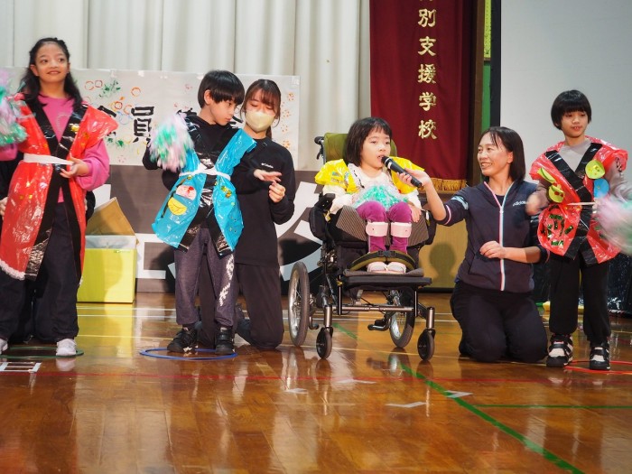 今でも大人気の「ザ・ドリフターズ」のいろいろなコーナーの曲を使って、一人一人の頑張っていることを発表しました。音を聴きながら歩いたり止まったり、顔を客席に向けたりするコーナー、ひげダンスの曲や早口言葉の曲をBGMに、箱を積んだりボールを蹴ったり投げたり渡したりしました。また、頭にお皿を乗せて歩いたり大きな箱を引っ張ったりすることや、言葉を機器に入力したり平仮名を読んだりすることを披露しました。最後は、「ババンババンバンバン♪」とみんなで歌って「だい・せい・こう」! みんな笑顔で締めくくることができました。